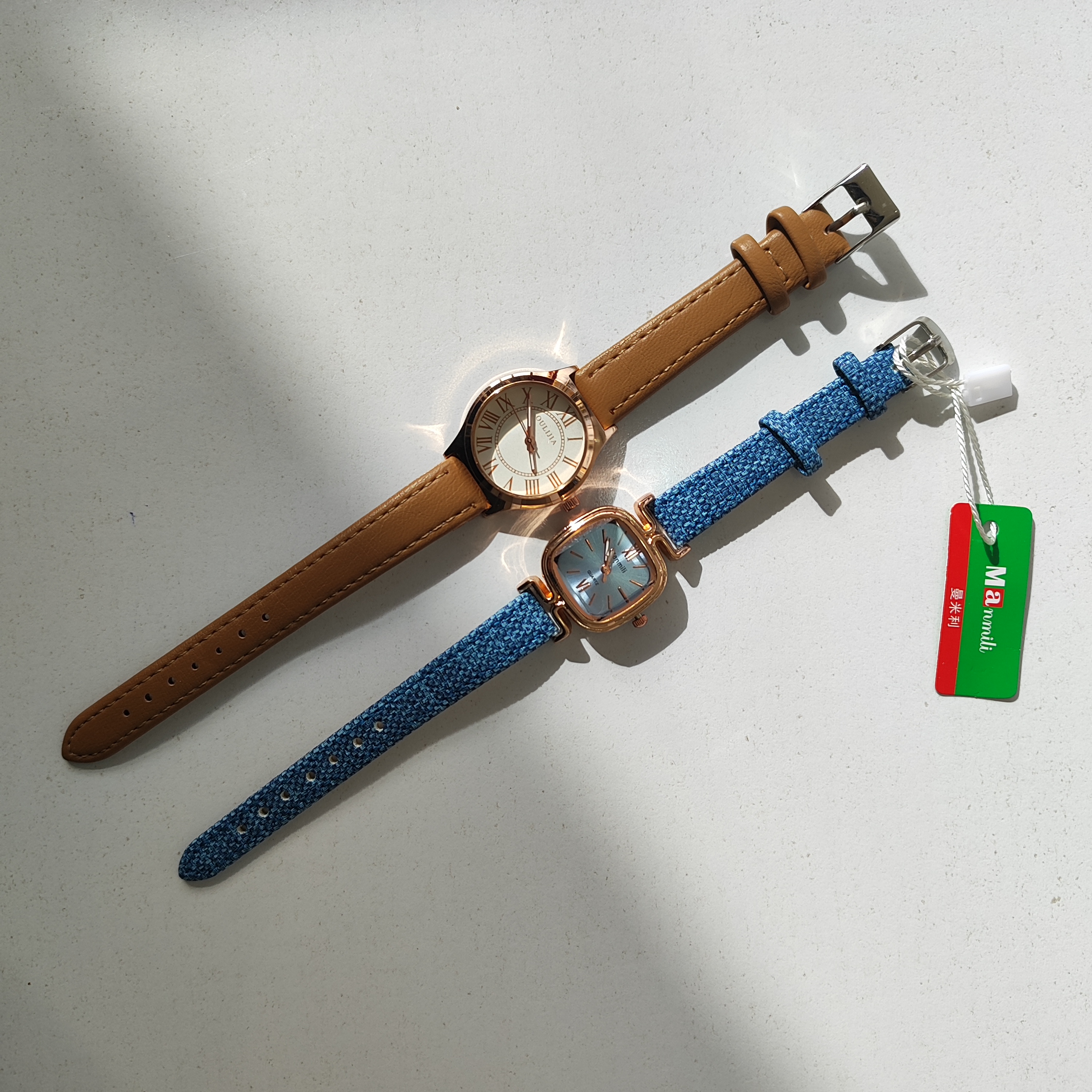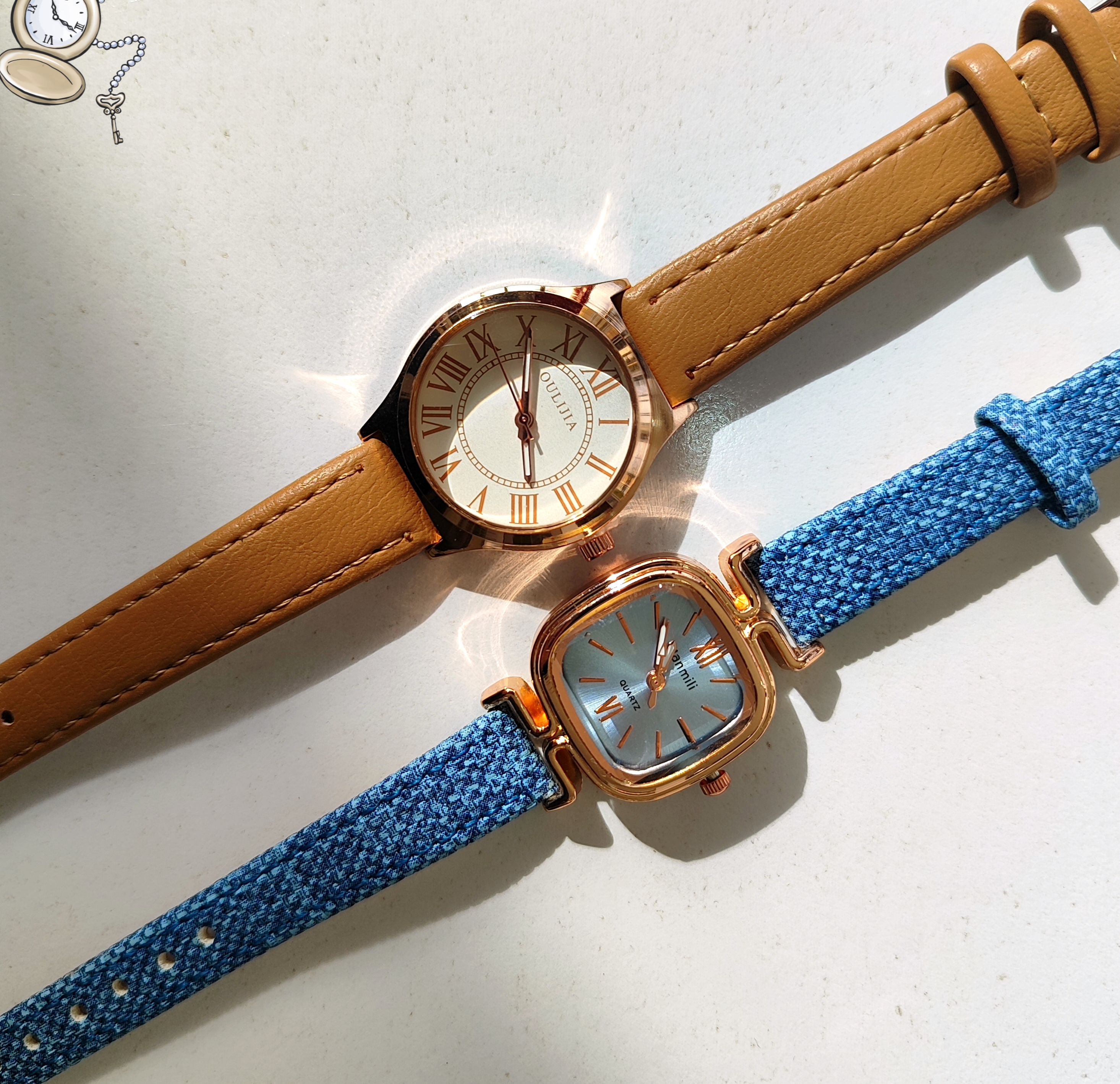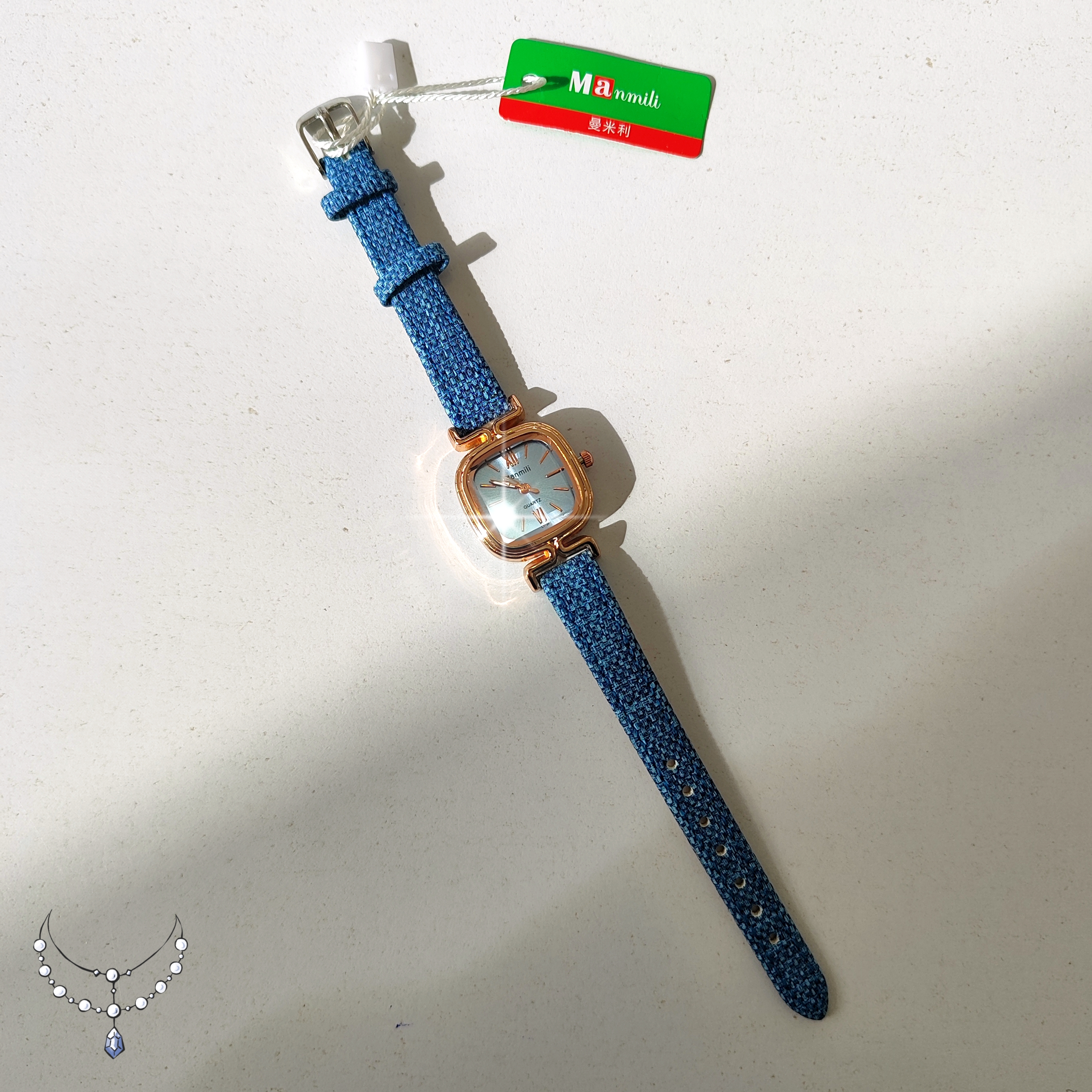 جنس بند ساعت آبی رنگ کبریتی میباشد💙ساعت کلاسیک و مینی قد بند آبی رنگ درکل۲۲سانت میباشد. رنگ کرمی ساعت :جنس بند چرم میباشد 🤎 قد بند ها۲۴ میباشد🌱